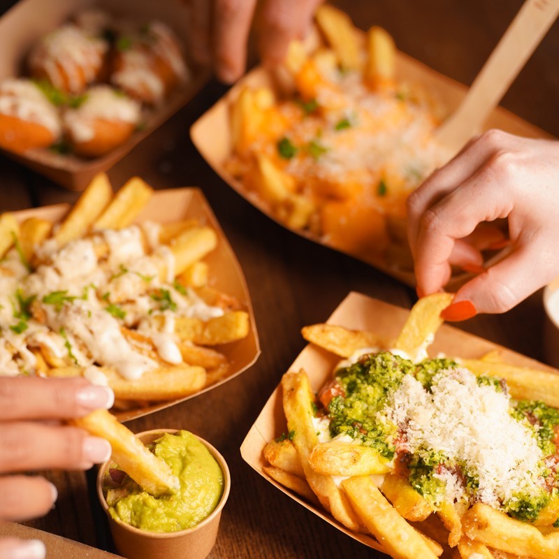 Eine große Portion Hausfritten trifft auf cremiges Stracciatella di Burrata, italienischen Sugo aus sonnengereiften Tomaten, würziges Pesto und herzhaften Parmesan. Prego! …..